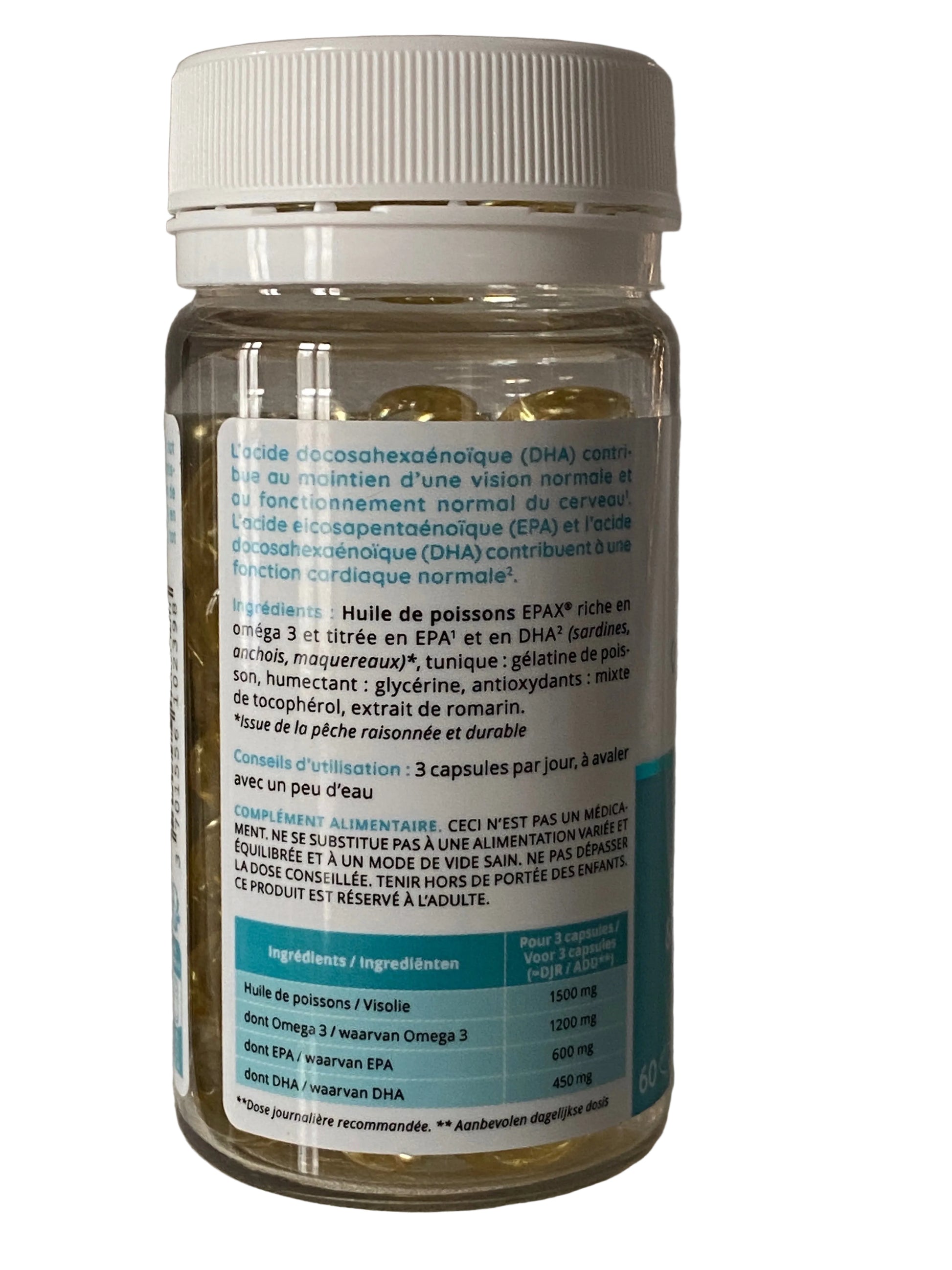 Ingrédients : Huile de poissons EPAX® riche en oméga 3 et titrée en EPA1 et en DHA2