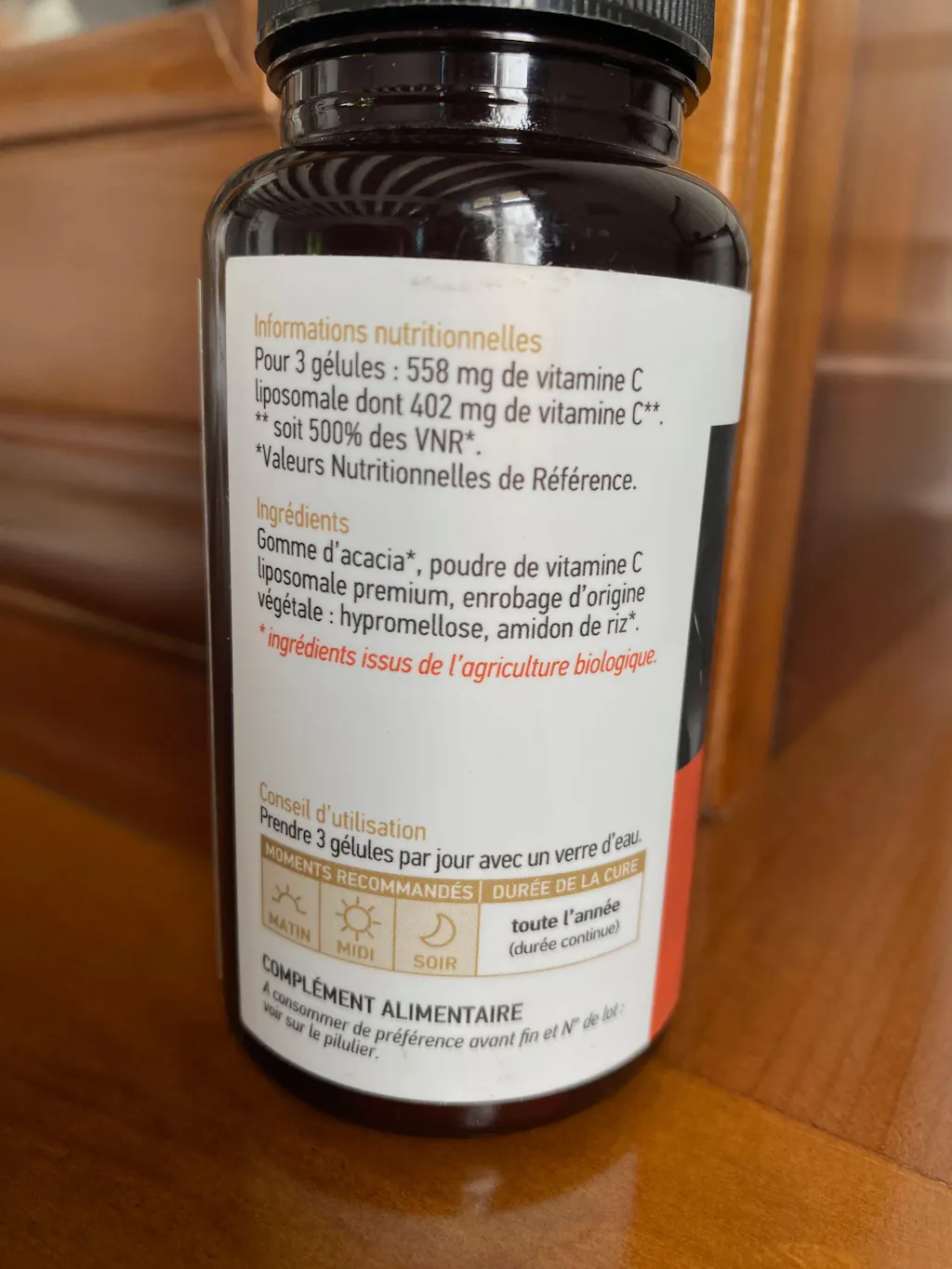 Ingrédients : Pour 3 gélules : 558 mg de vitamine C liposomale dont 404,4mg de vitamine C**. **soit 500% des VNR*. *Valeurs Nutritionnelles de Référence. Gomme d’acacia*, poudre de vitamine C liposomale premium, gélule végétale : hypromellose, amidon de riz*. *Ingrédients issus de l’agriculture biologique.
